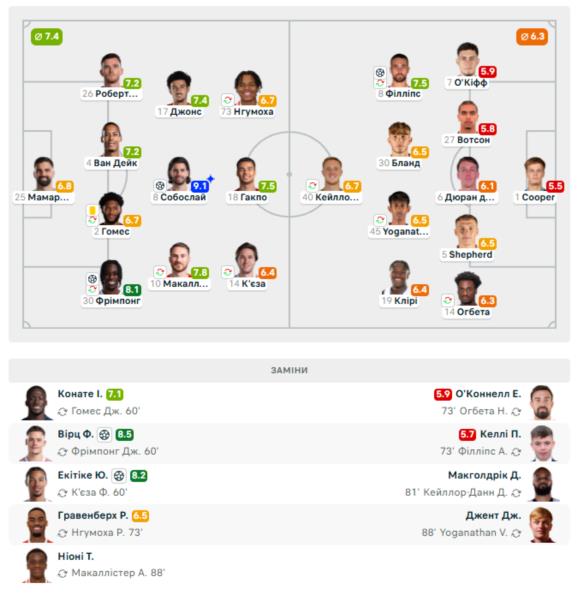 Голи: Собослаї, 9, Фрімпонг, 36, Вірц, 84, Екітіке, 90+4 — А. Філліпс, 40
